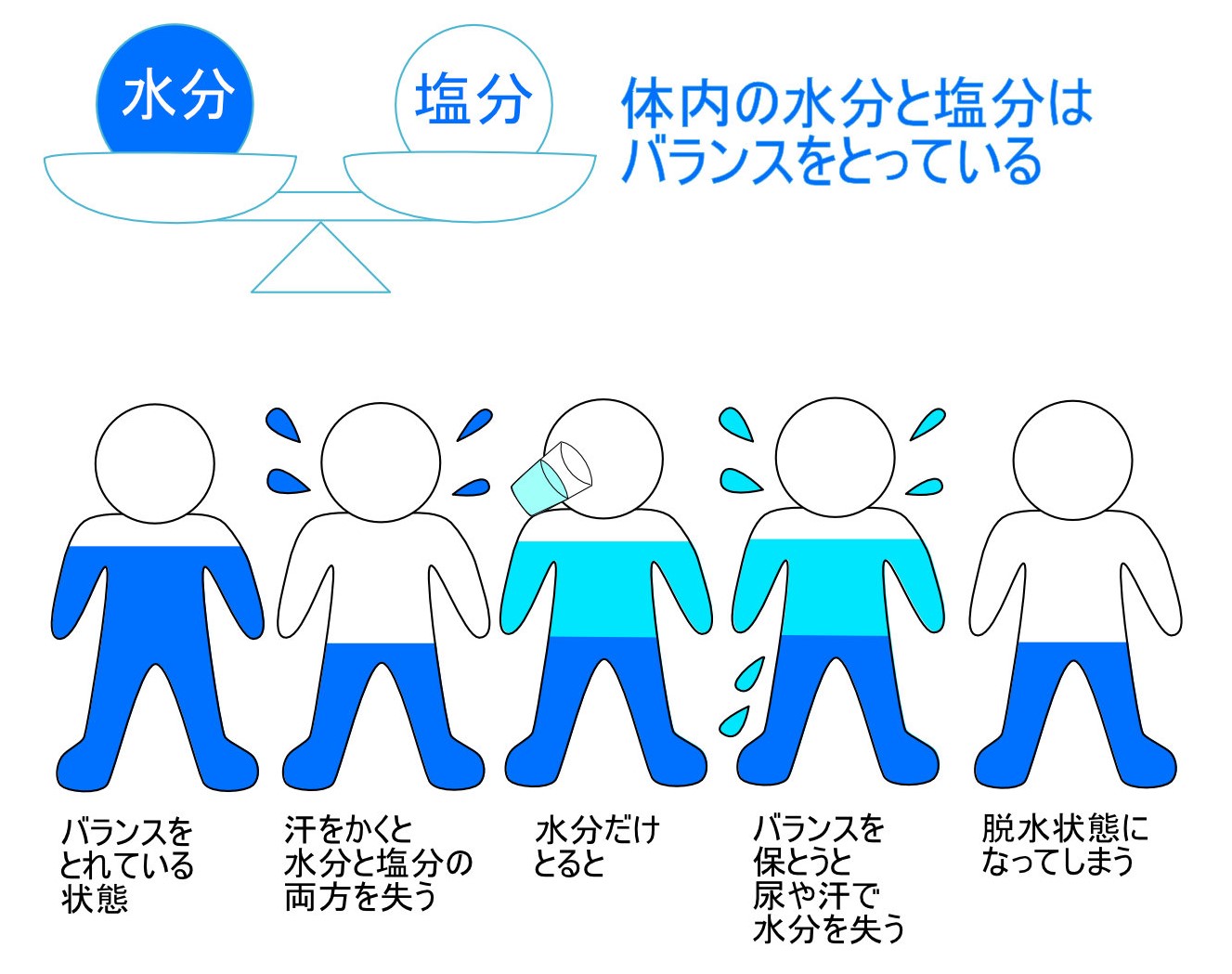 水分補給と言っていますが、大量に汗をかいた場合などはただの水だけを摂取しても塩分もとらなければ体液が薄まってしまい余分な水を出そうという働きが進み、脱水状態になってしまいます。