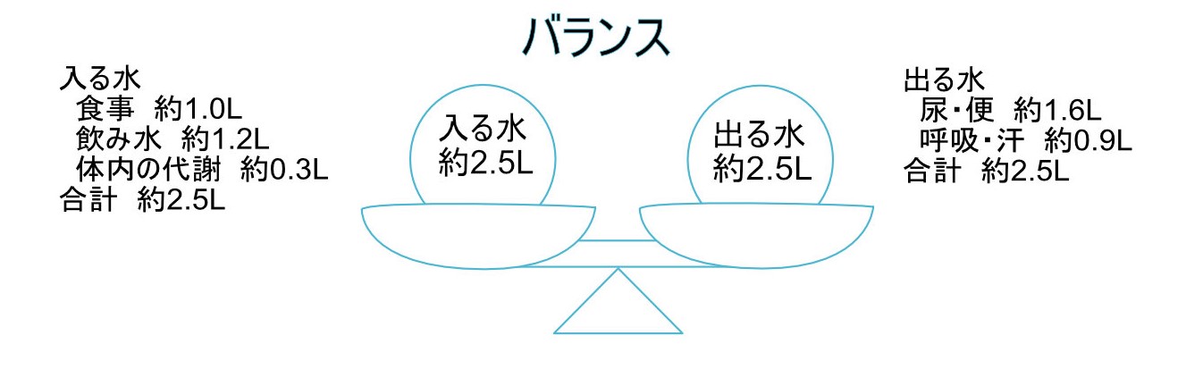 1日に水分量は変化し、食事などによって入ってくる水分と尿や汗などで出ていく水分量(体液)はバランスをとっています。