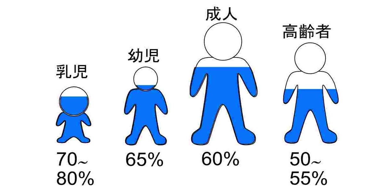 年齢などにより人間の体内の水分量(体液)には違いがありますが成人で約60%です。